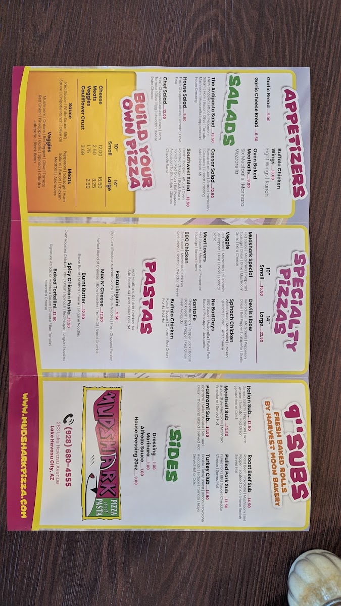 Introducing the menu of Mudshark Pizza & Pasta, a delightful dining destination located at 283 Lake Havasu Ave, Lake Havasu City, AZ. This vibrant venue, an outpost of Mudshark Brewery, showcases an enticing array of freshly made pizzas and pastas, all served in a welcoming, newly remodeled space.